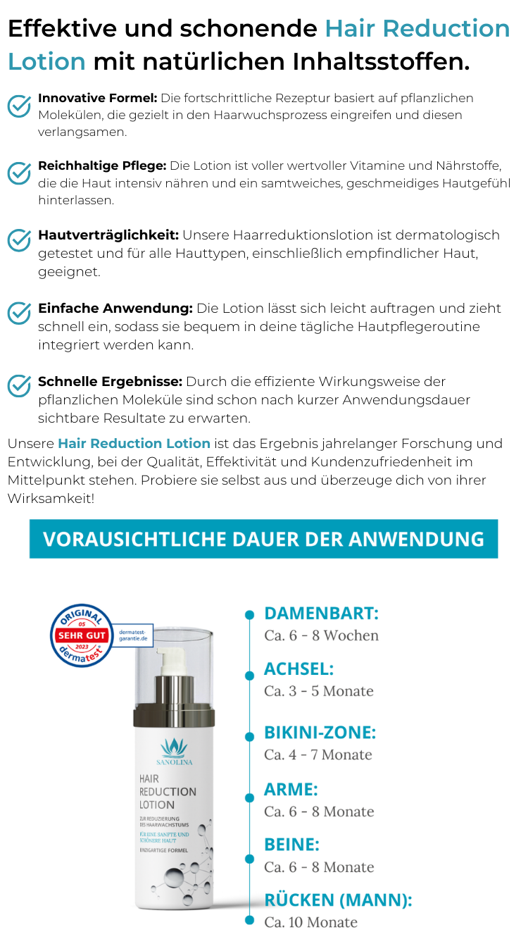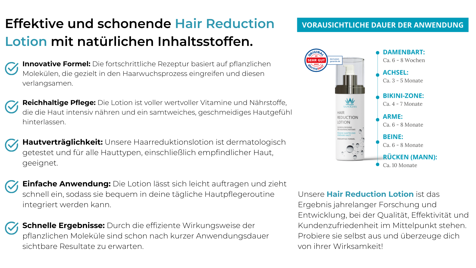 Ob feiner Flaum über der Oberlippe, störende Haare am Kinn oder nachwachsende Augenbrauenhärchen – das Bedürfnis nach einer wirksamen und sanften Lösung ist groß. – die Hair Reduction Lotion ist die Antwort auf diese Herausforderungen.