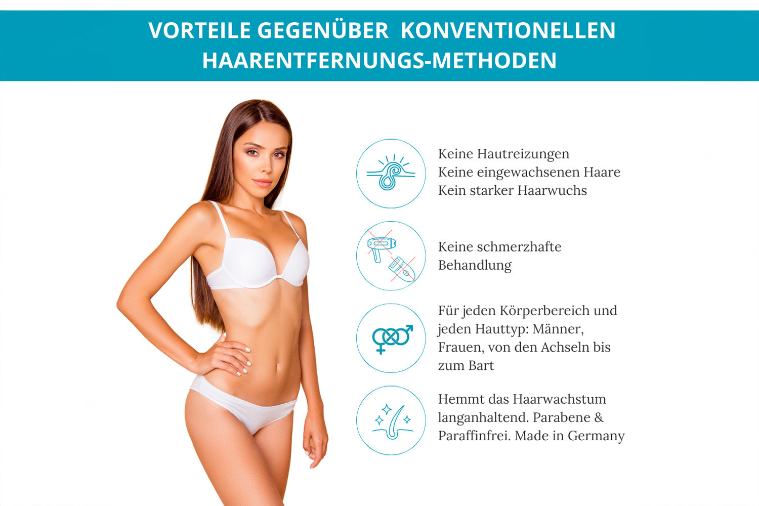 Unser Produkt bietet zahlreiche Vorteile gegenüber anderen Haarentfernungs-Methoden. Dank unserer jahrelangen Expertise haben wir das perfekte Produkt zur Haarentfernung auf den Markt gebracht!